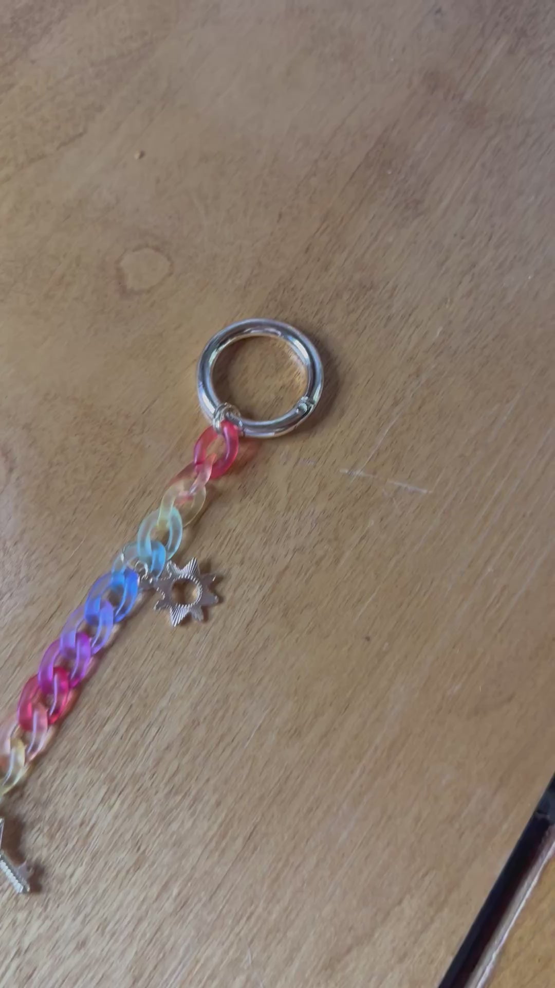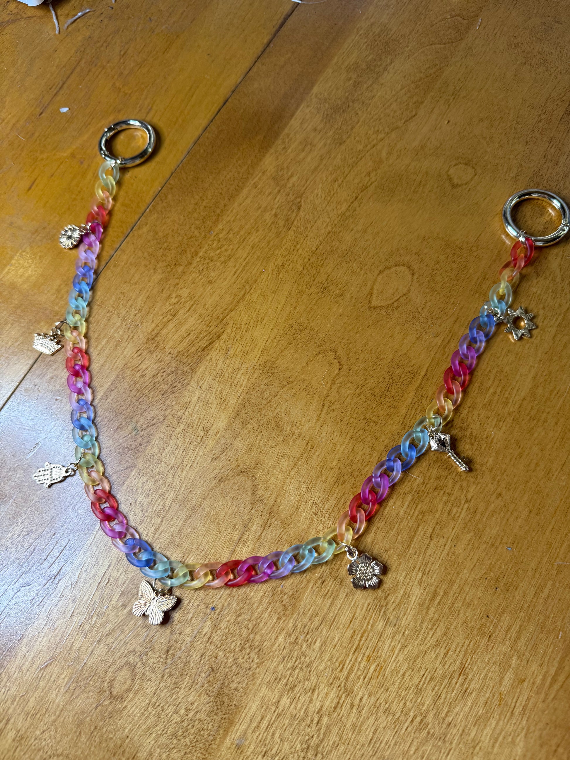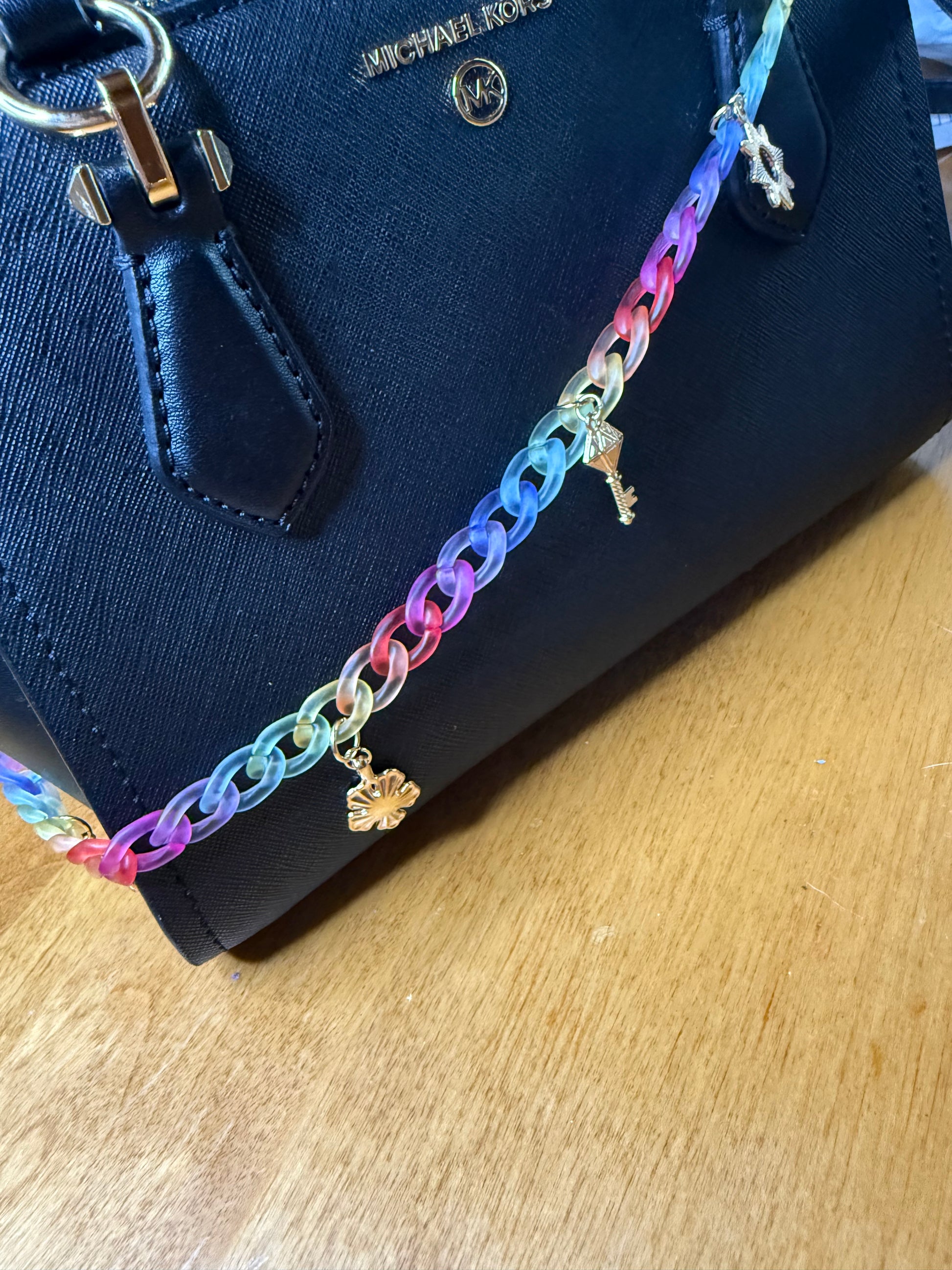 Upgrade your handbag game with our 20 inch rainbow purse chain. The beautiful rainbow chain link adds a touch of fun and the adorable gold charms bring a touch of elegance. Elevate your style with this unique accessory.