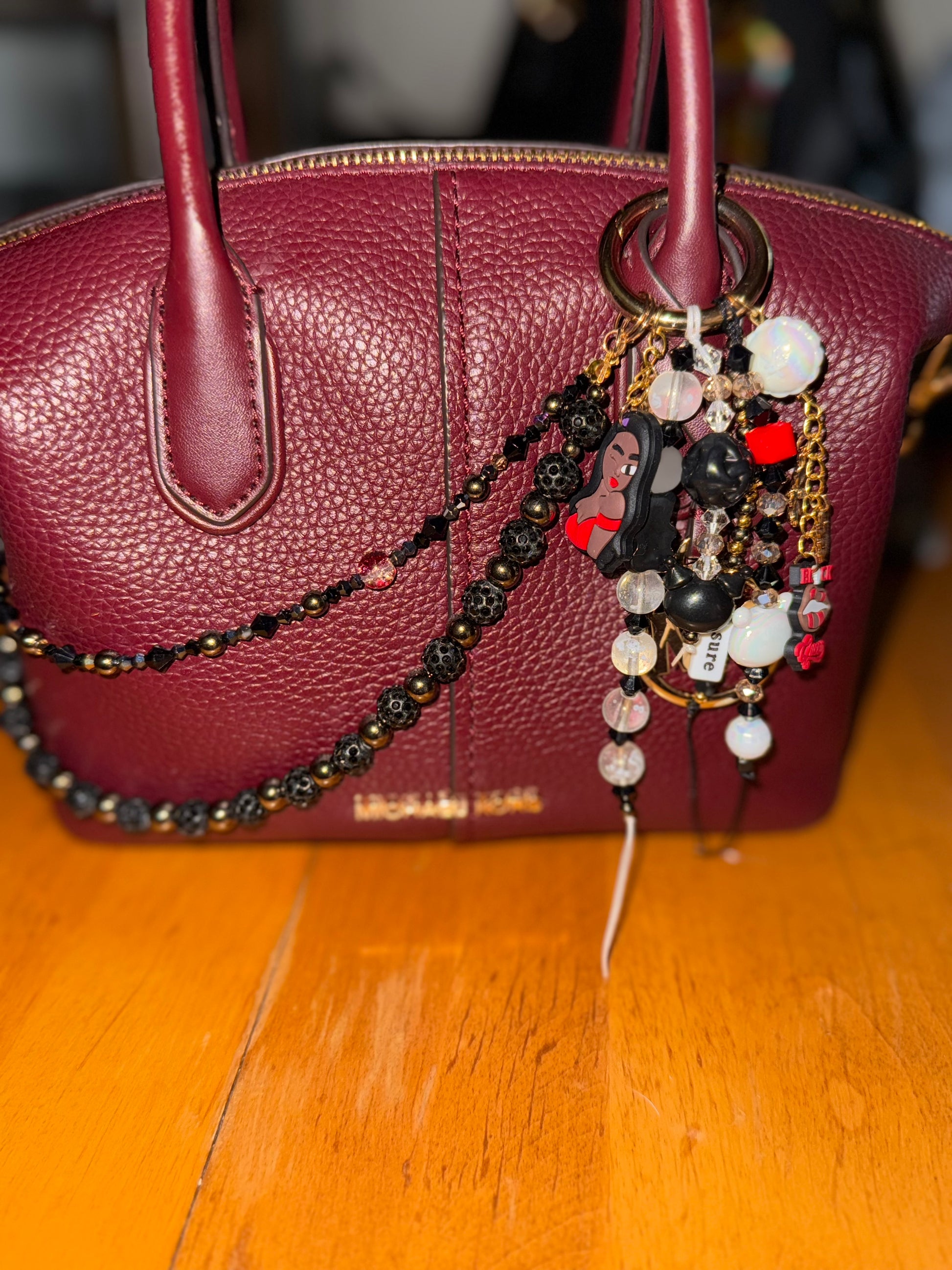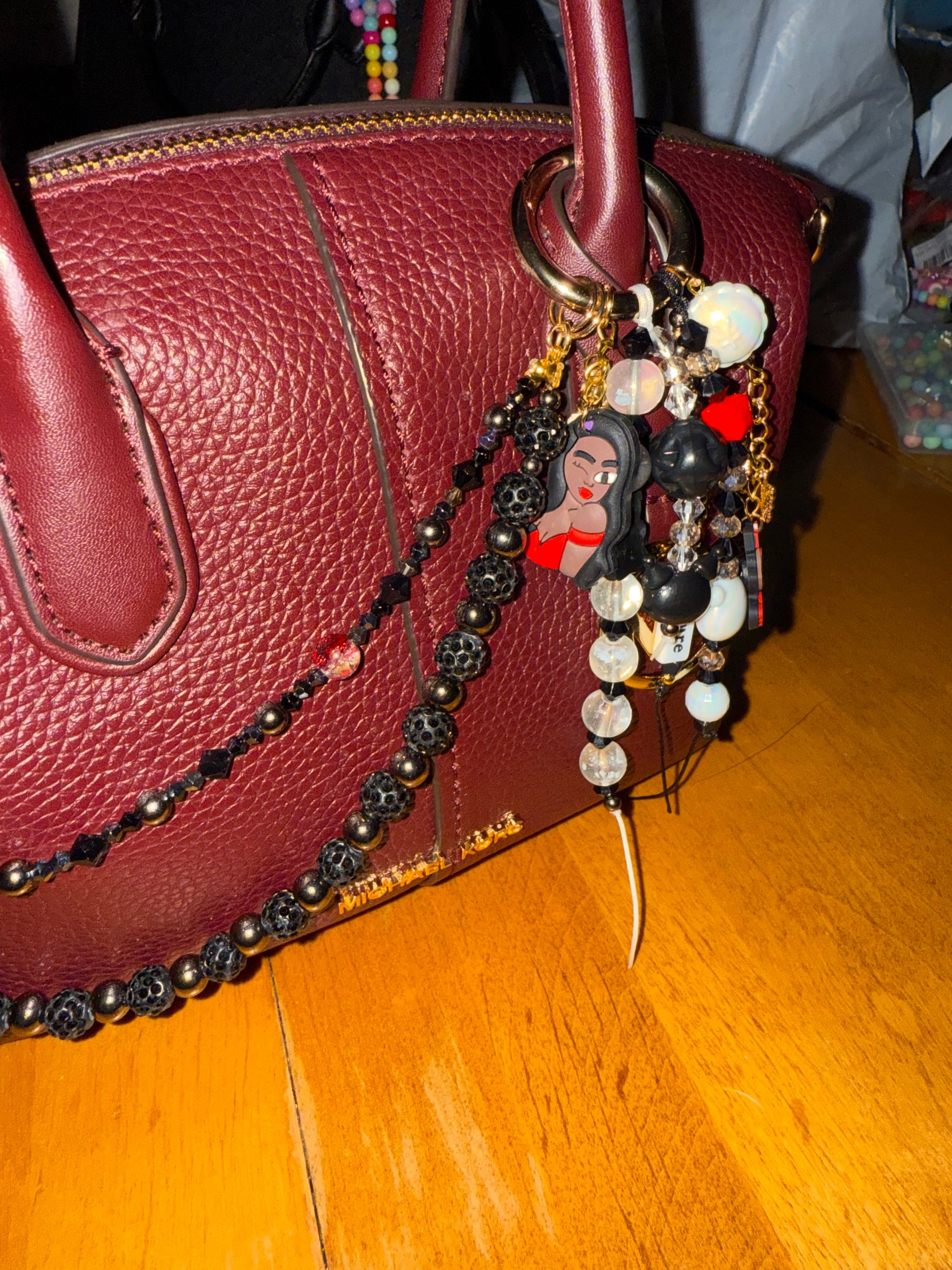 Add a touch of culture and elegance to your purse with our Black Queen Purse Charm. This unique charm features clay beads, sparkling rhinestones, and a vibrant red accent. Make a statement and showcase your pride with this charming addition to your accessories.