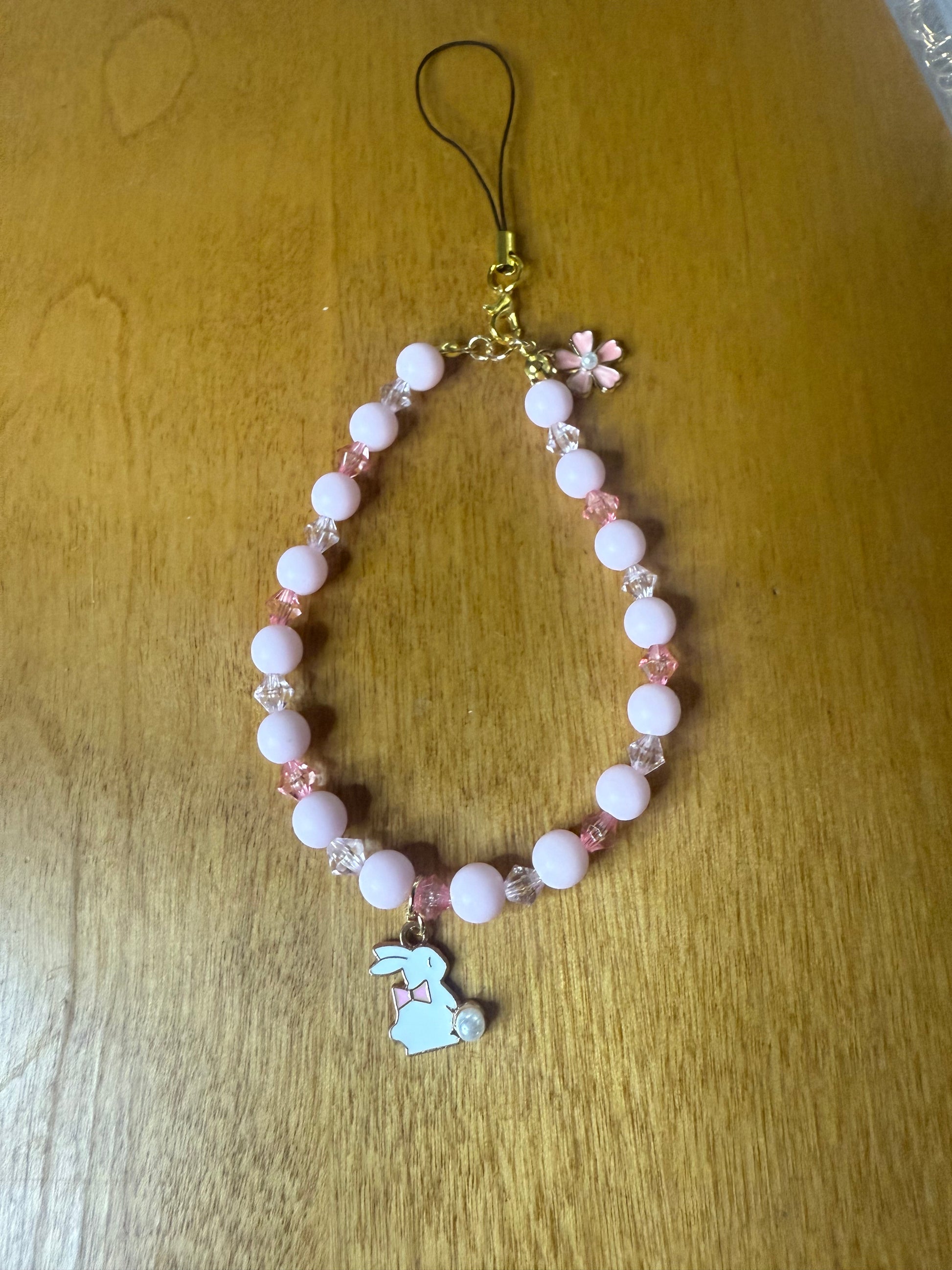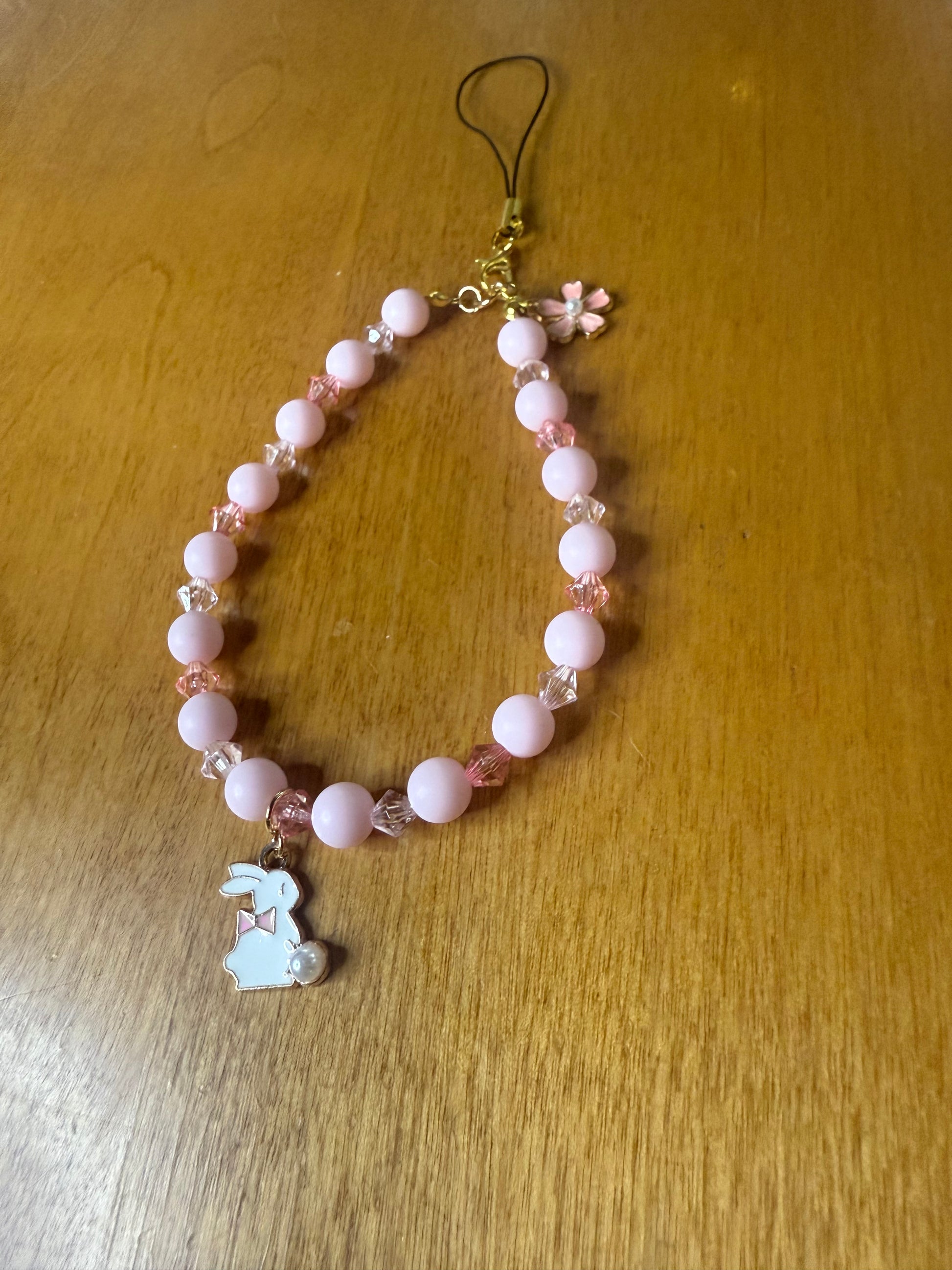 Enhance your phone's style with our Pink Bunny Bracelet and Phone Charm. Its cute pearly bunny charm with a delicate flower pearl adds a touch of elegance while protecting your phone. The perfect accessory for any tech-savvy fashionista.