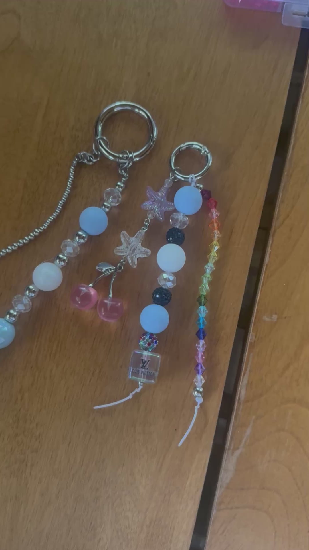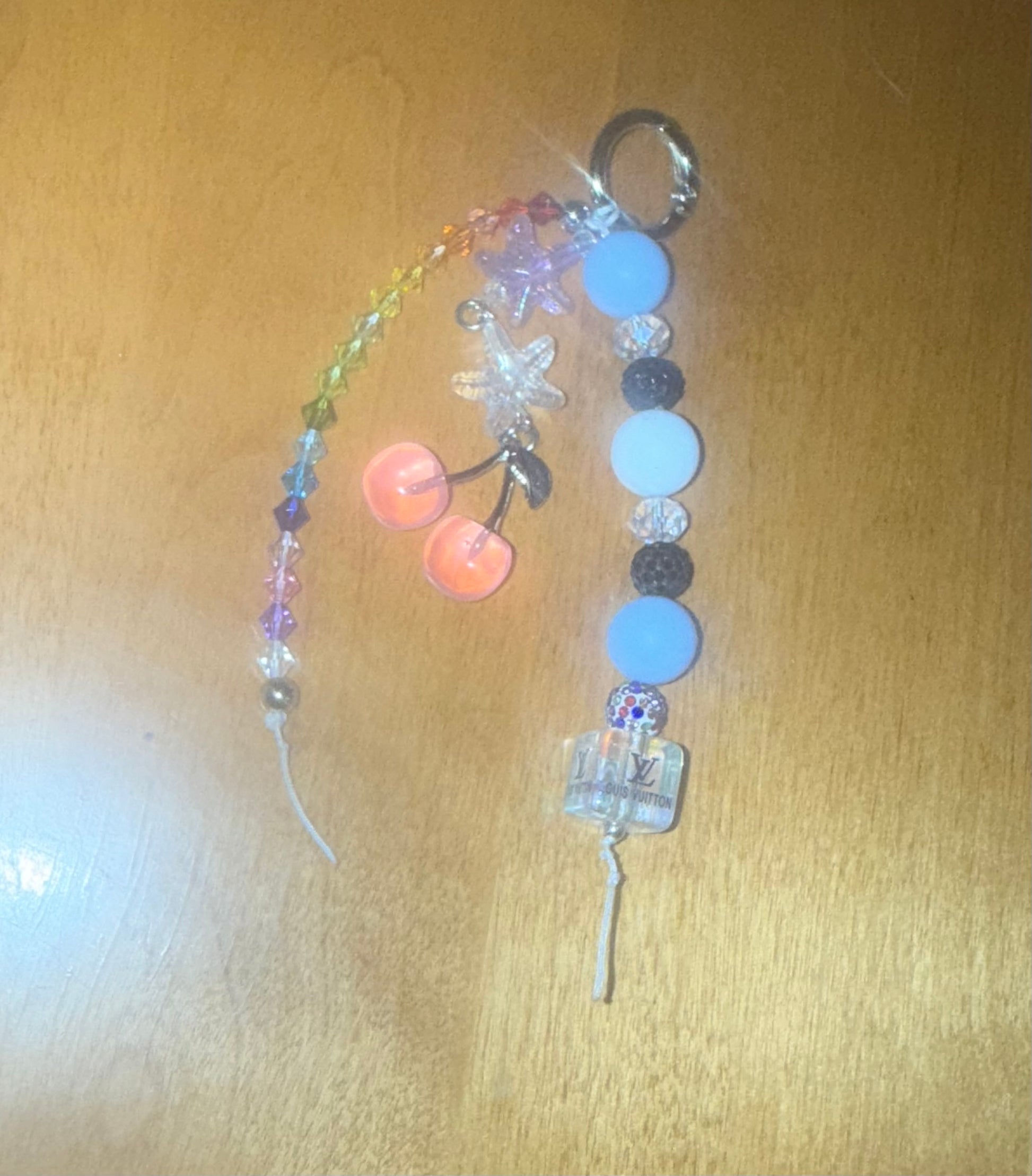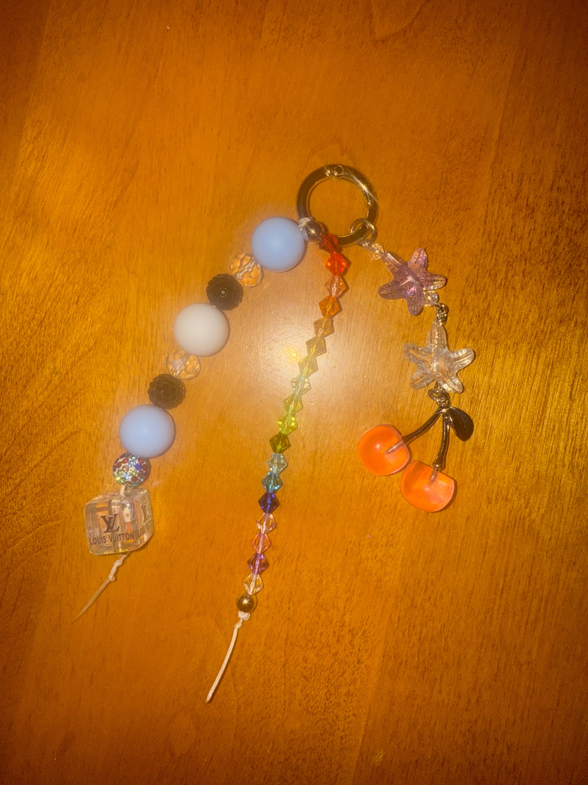 Elevate any bag's style with the Pink cherry and LV charm. This adorable purse charm boasts a splash of designer beads, adding a touch of color and luxury to your accessory game. Elevate your look with this chic and trendy charm.