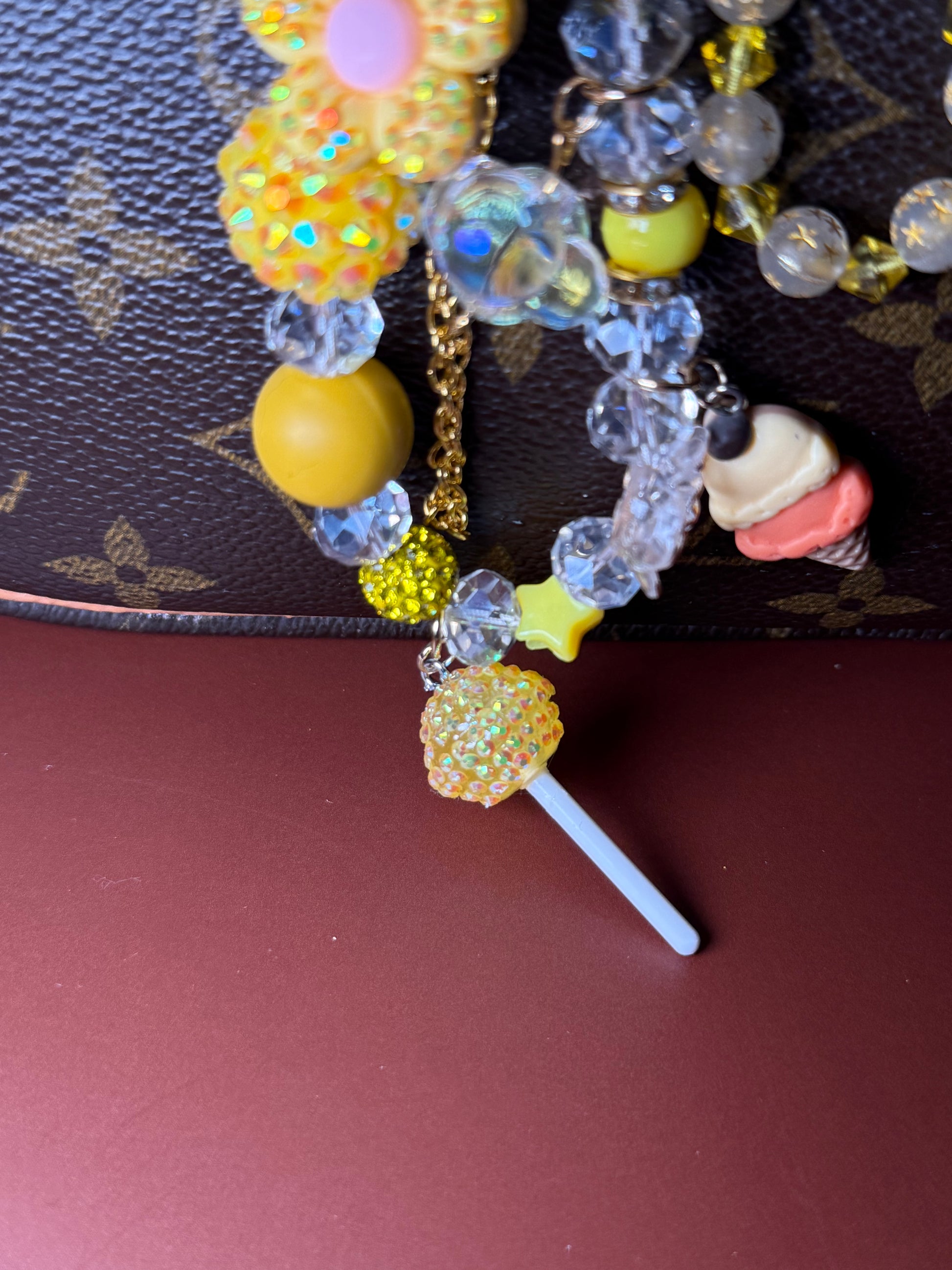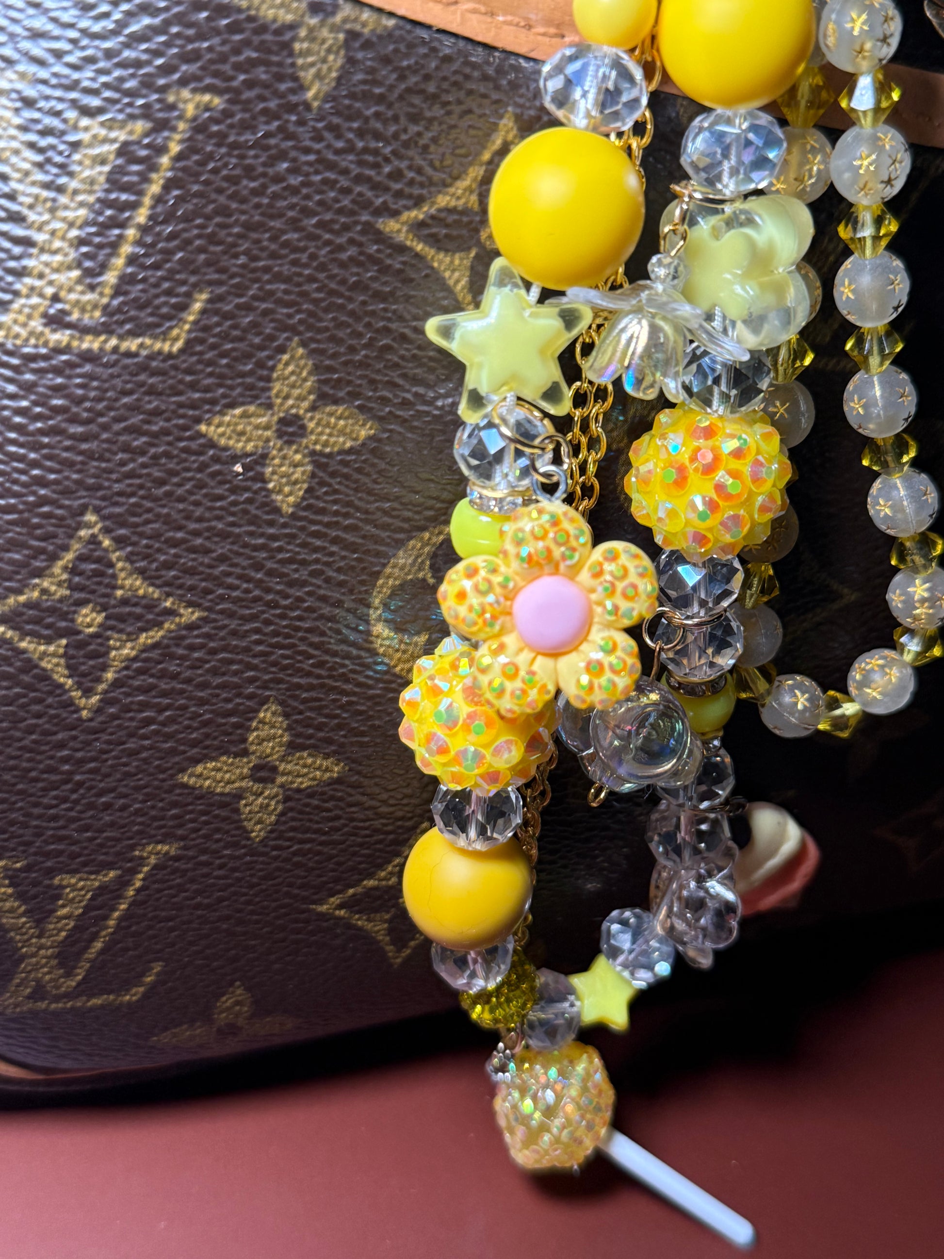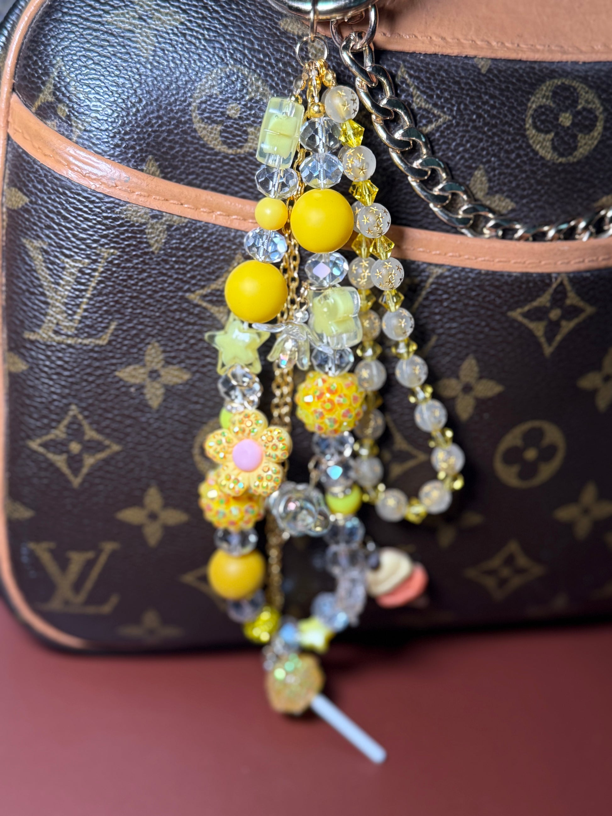 Elevate your purse game with our Yellow glamsucker Purse Charm. The bright yellow color and bedazzled beads and charms add a touch of glamour to any bag. Upgrade your style with this eye-catching accessory.